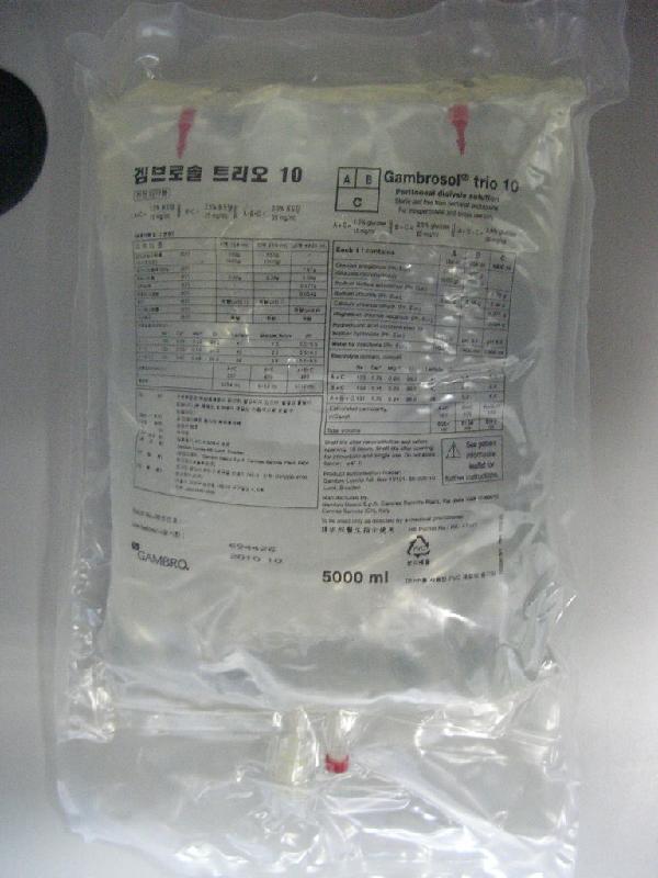 衞生署發言人今日(九月十日)表示,持牌藥品入口商瑞典金寶醫療用品有限公司回收一批五公升裝腹膜透析液(Gambrosol Trio 10 P.D. solution註冊號碼HK-47327)。