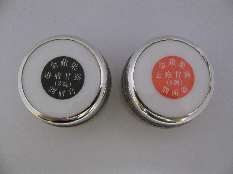生署在調查有關個案時在一零售攤位購買相關和其他相類產品作化驗。政府化驗所的化驗結果顯示,兩種產品,即「金蘋果療膚甘露(3號)潤膚膏」及「金蘋果去痘甘露(8號)潤面霜」,均含有「甲硝唑」、 「咪康唑」、「紅霉素」、「氯霉素」、「氯苯那敏」及「水楊酸」。另外,「金蘋果療膚甘露(3號)潤膚膏」還含有「灰黃霉素」、「甲基水楊酸」及微量「地塞米松」和「氯倍他索」。