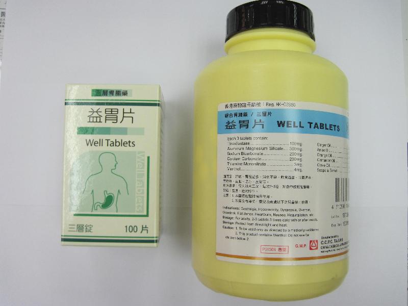 当中须强制回收的产品名为「益胃片」(注册编号:HK-02886),化验结果显示,该产品含百万分之1.2的「邻苯二甲酸二(2-乙基己酯)」。「益胃片」是一种胃药,由台湾中国化学制药股份有限公司生产,透过本港源医药公司(启源)入口在港经销。该产品有两款包装(100粒瓶装和1000粒瓶装)。
